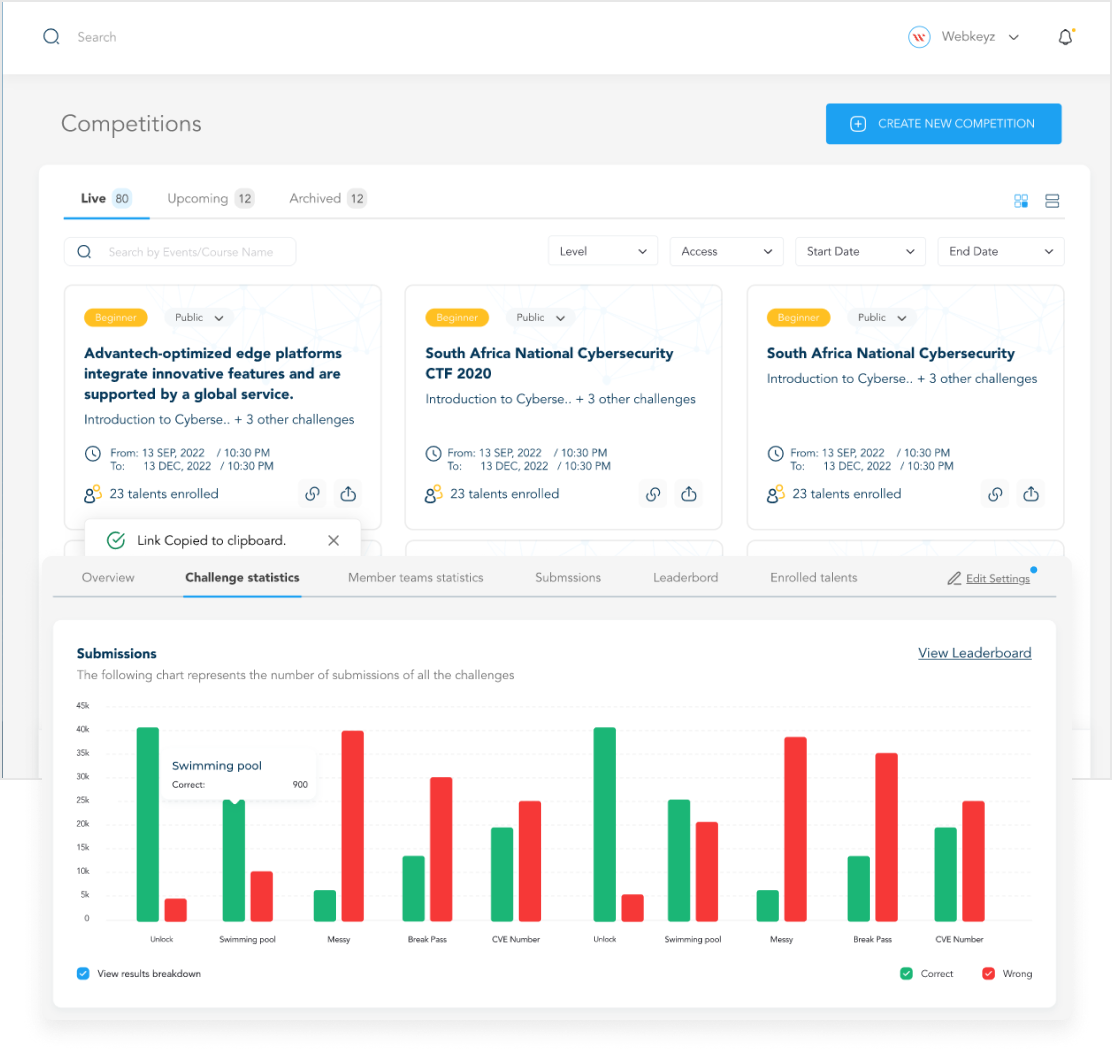 With our platform, you can enhance your employees' or students' skills by creating custom CTF competitions, tailored to your specific needs. Craft unique challenges and scenarios that simulate real-world situations, allowing you to evaluate their expertise effectively.